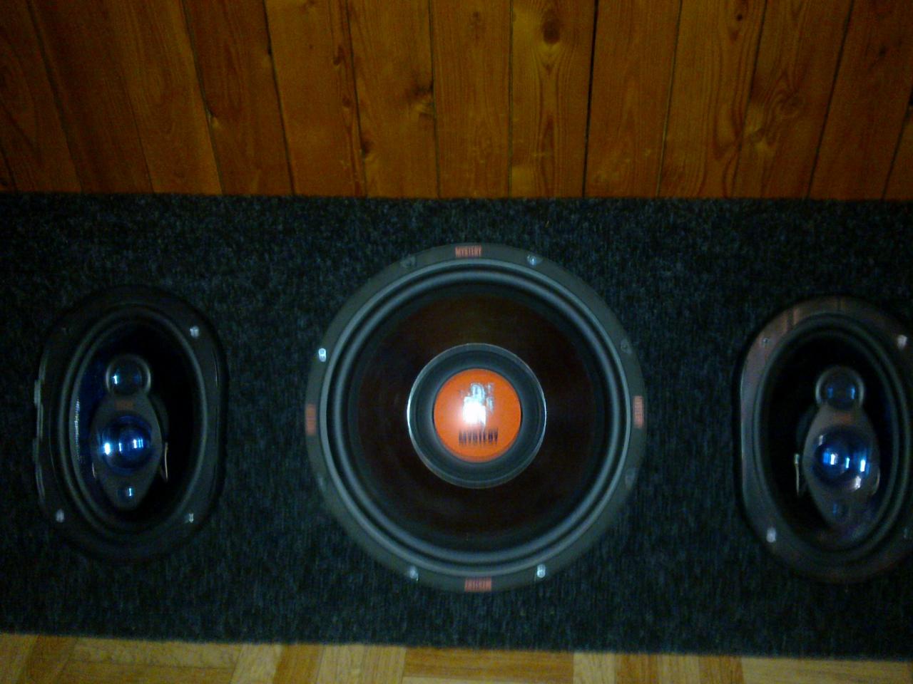 Полка фанера 1,5см ширина 103 см, высота 31 см, длина 29см.Сабвуфер пассивный MYSTERY MJS 12F, 250 WATS RMS, 500 W MAX, 90 DB, 1W/1M. +2 колонки MYSTERY CALYPSO 100wats. 93db. Все новое, на машине не стояли , только смонтированы. Цена 650гр, торг