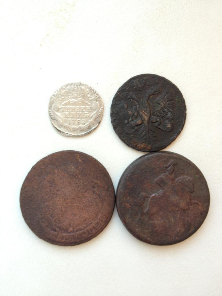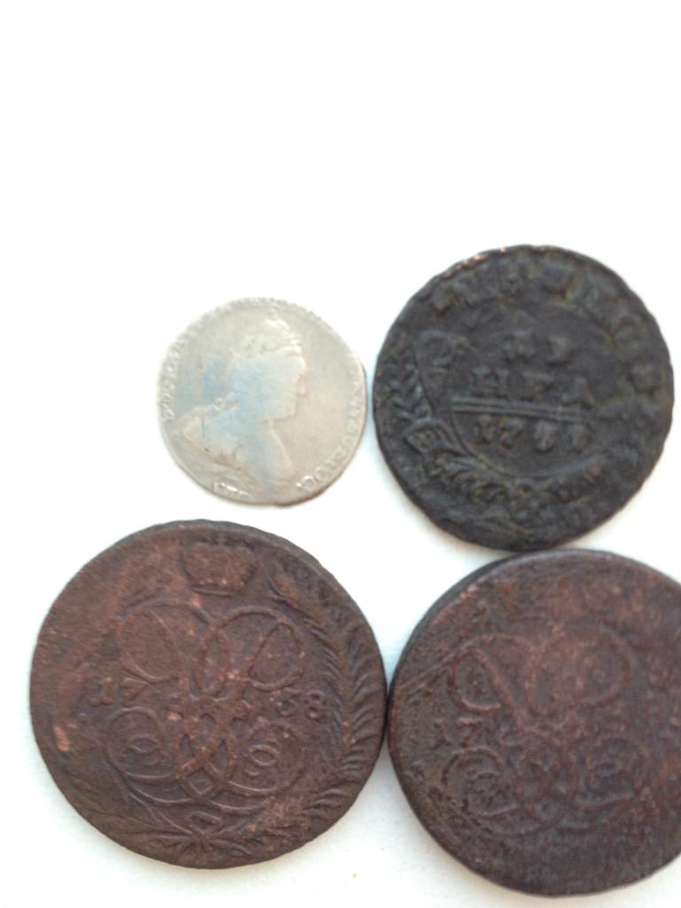 гривенник 1783г 2коп. 1758г. 2шт. деньга перечекан с петровской копейки б.к.сверху видна надпись