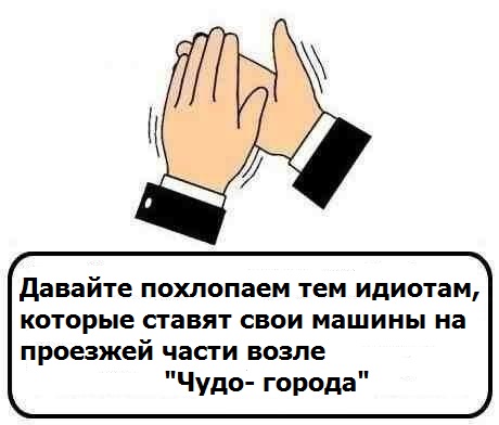 Ну возле чудо города есть, большая площадь,пустющая, скоро будет парковка для машин, когда сдадут все плоащали, если машину просто переставить на 5 метров в глубь ,то ничего страшного не будет, но из-за того что я бросил свою машину там где мне удобно, вы не должны мучатся как проехать данный участок дороги, и на оборот, Я не должен мучатся. Просто у нас все так, мне надо я сделал, а на остальных мне насрать.