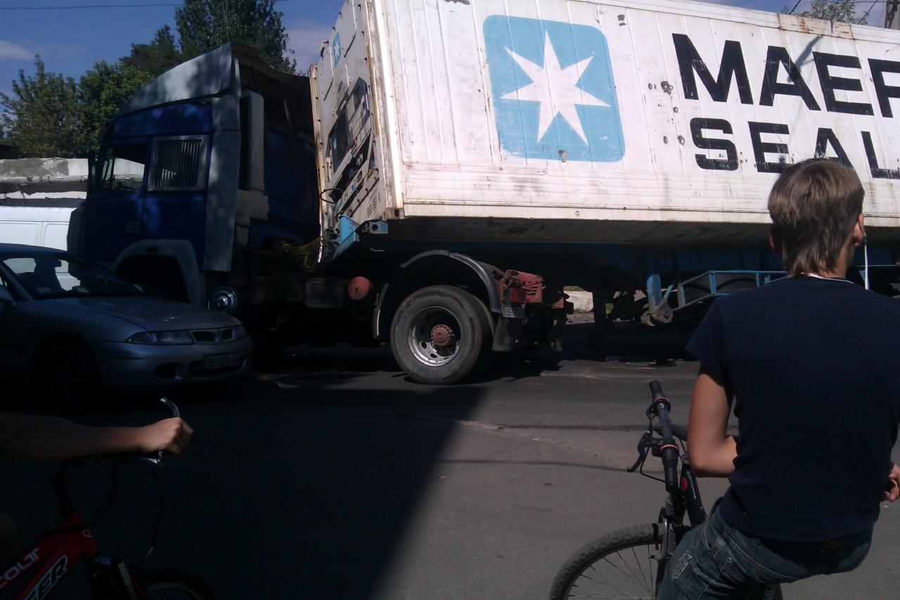 Видимо фура когда поворачивала продавила под правыми колесами асфальт (он был продавлен, но не провален) или просто возможно резко завернул, деталей не знаю, может кто знает??? контейнер справа был отцеплен и тросами его привязали к прицепу.