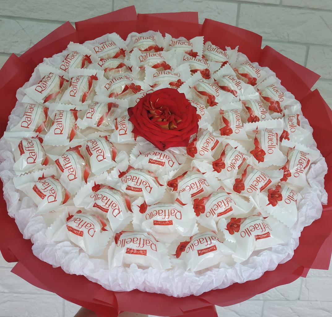 Букет из конфет Рафаэлло, внутри роз тоже Рафаэлло. 400 гр