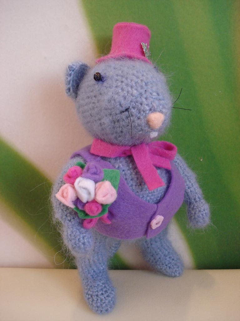 Игрушка связана крючком, лапы и голова выполнены в технике фильцевания, цветок из запекаемой пластики.
