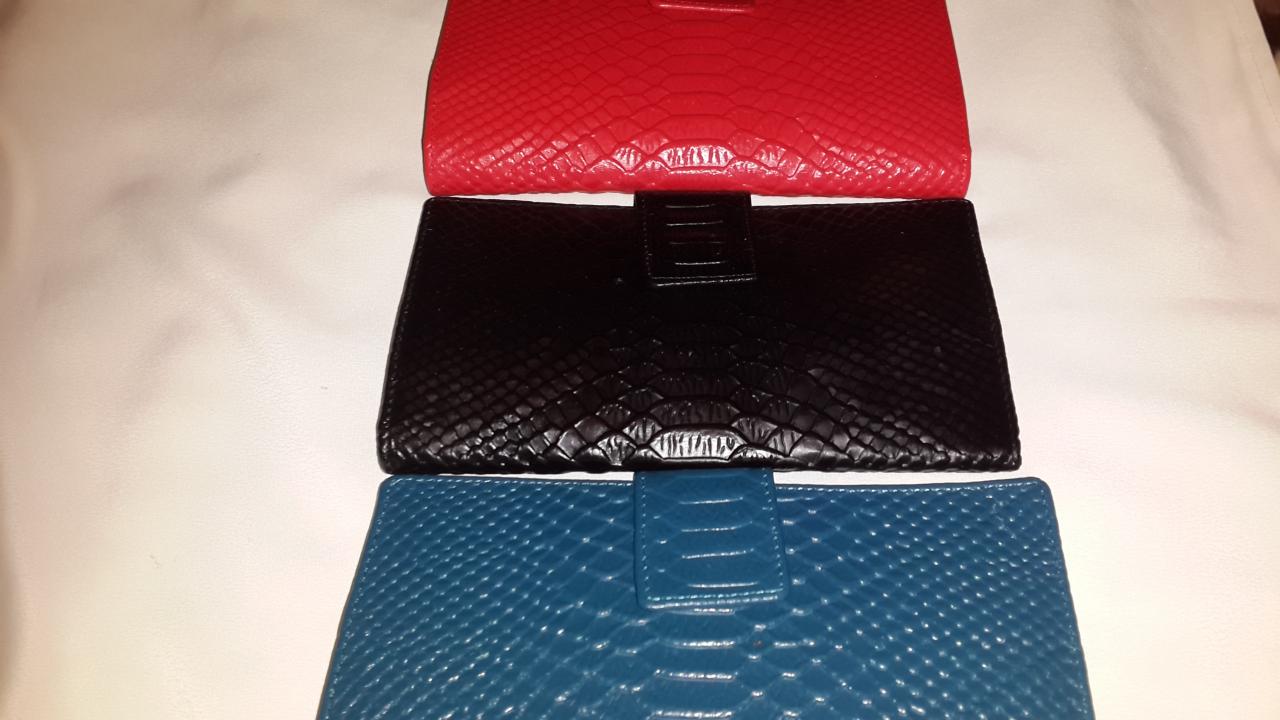 Продам стильный женский кожаный кошелек-бумажник. В наличии 3 цвета: черный, синий, красный.