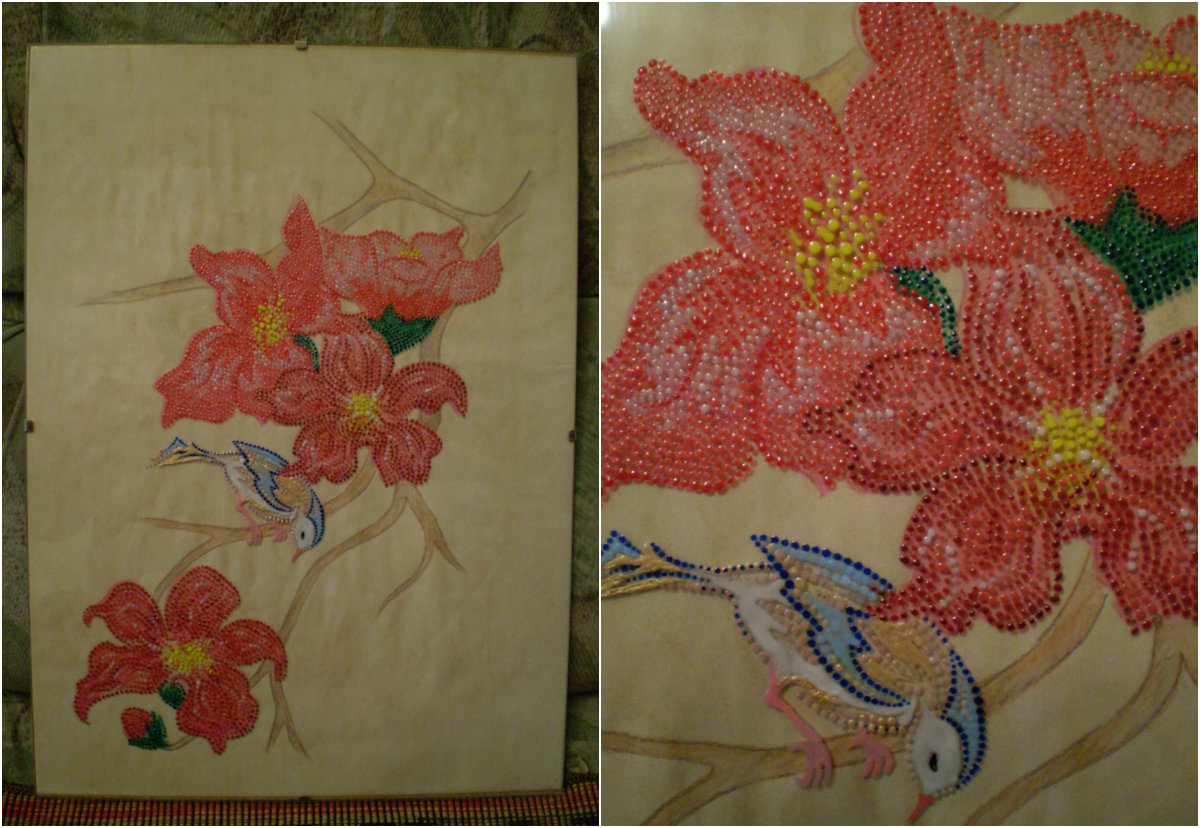 вот моя любимая картина.Рисунок выполнен на стекле.Под стекло я положила бумагу,которую состарила кофейным раствором