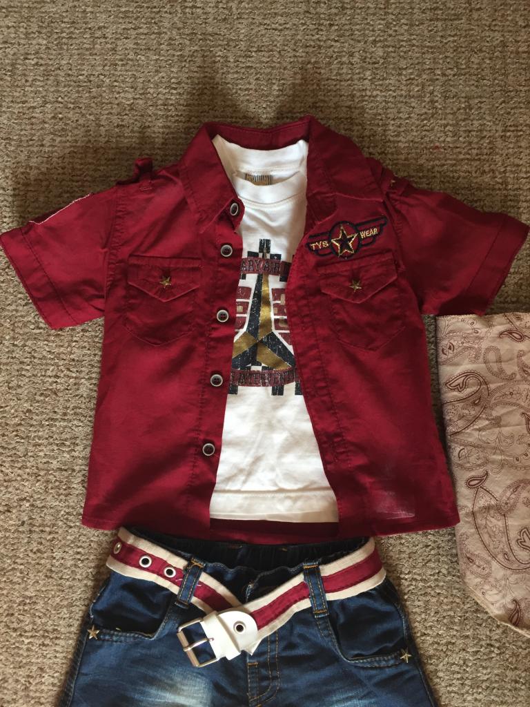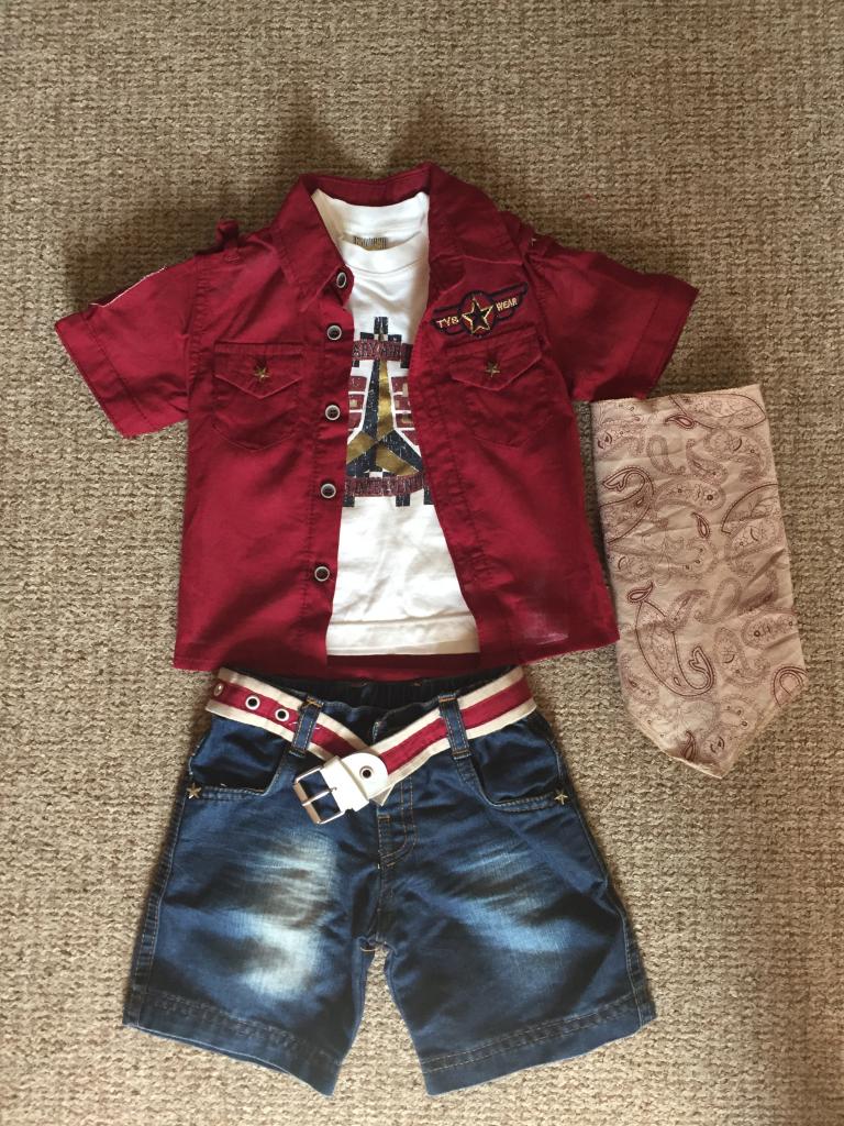 Продам летний костюм для маленького джентльмена. Рост 74 см. 9 мес. Отличное состояние, одевался 2 раза. Замеры: шорты на резинке талия - 42см, длина - 25,