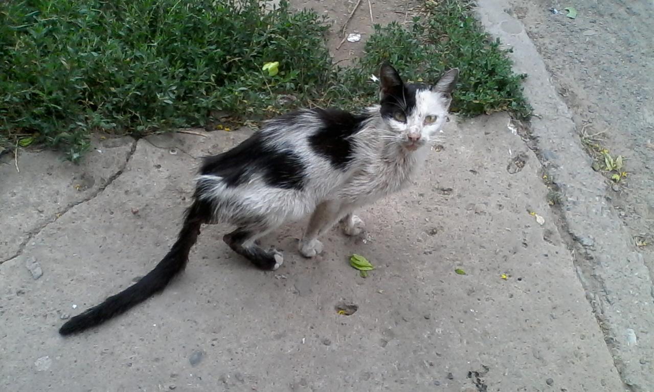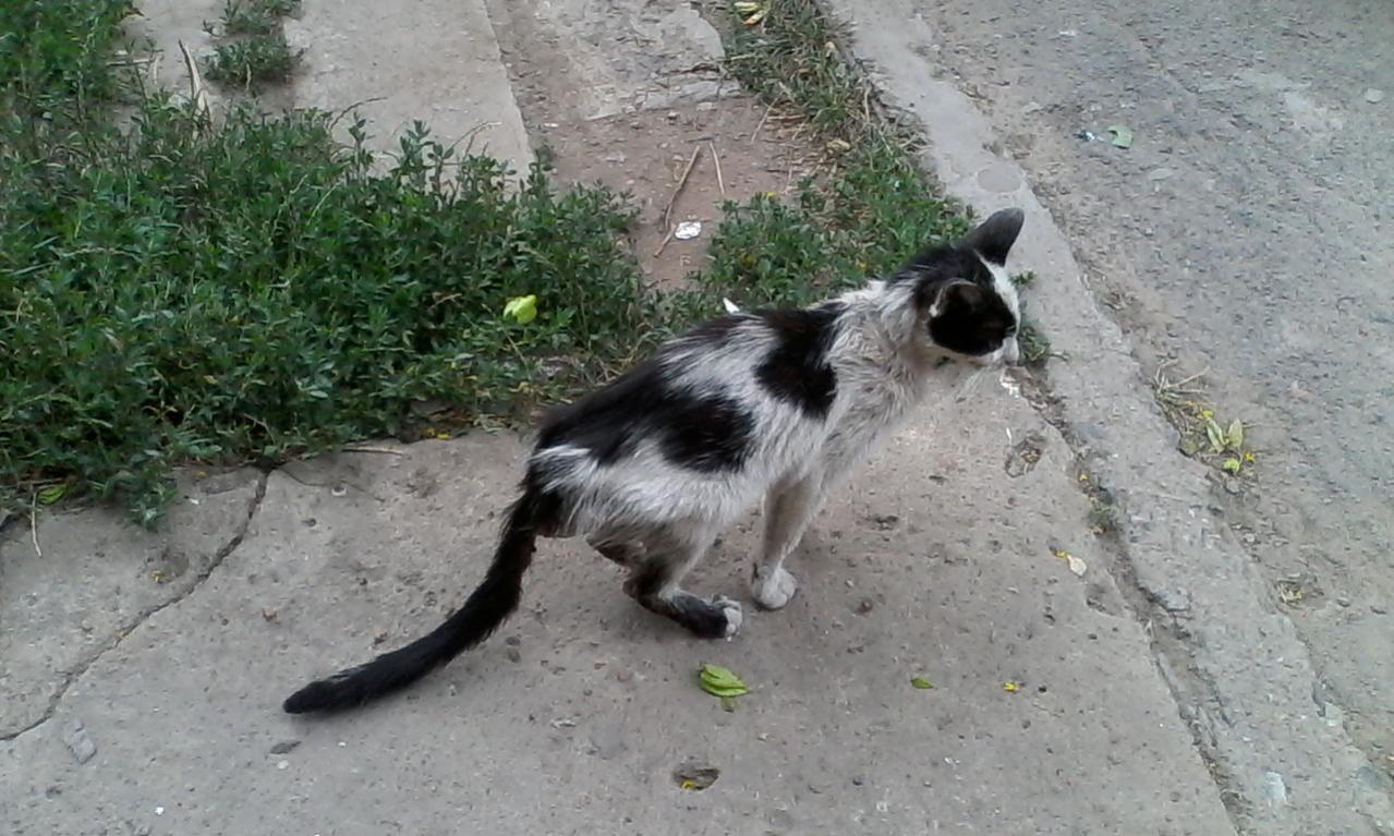 Кошечка, сейчас состоящая из одних костей, в прошлом черно-белая красавица, окрещённая моей дочкой в прошлом году Феей,за её изумительный взгляд, и похоже, мама, пристроенного мною в январе Снежка-Бэтмена, как выяснили у бабушек в соседнем дворе, живущая от нашего через двор.
