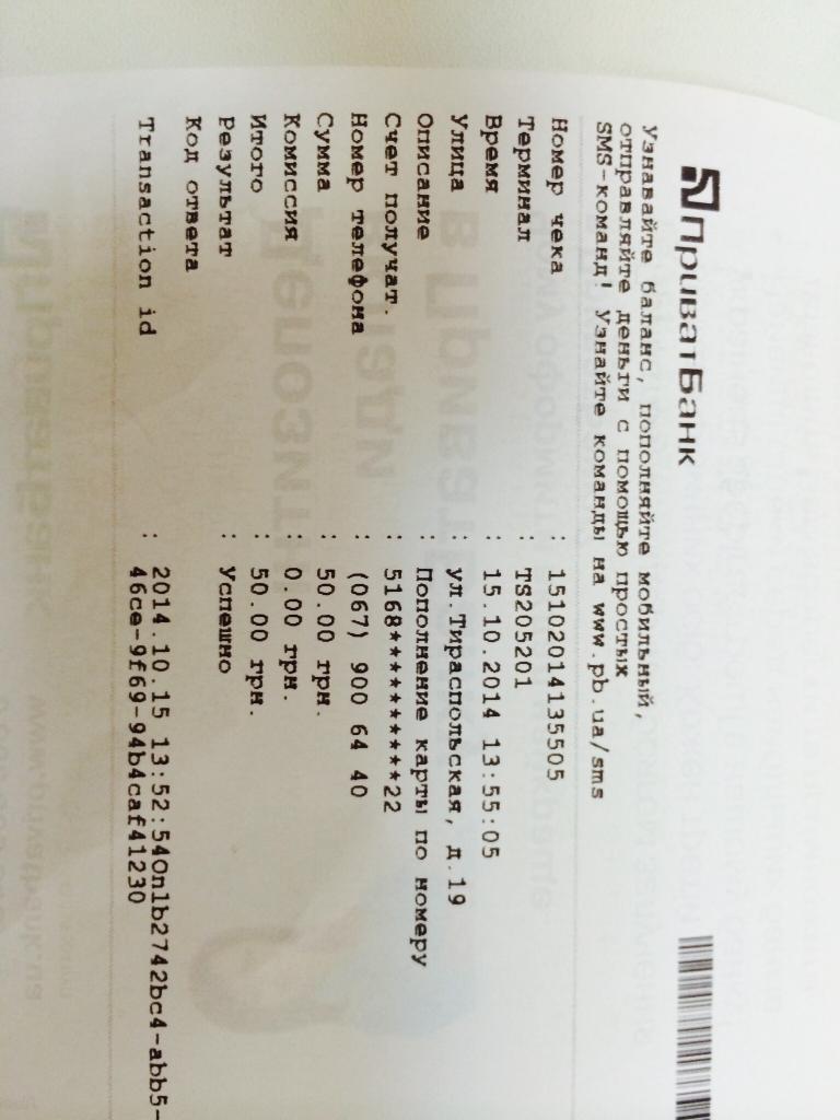 **5558 Получатель: 5168 **** **** 2222 Перевод личных средств 50.00 ГРН Проведено