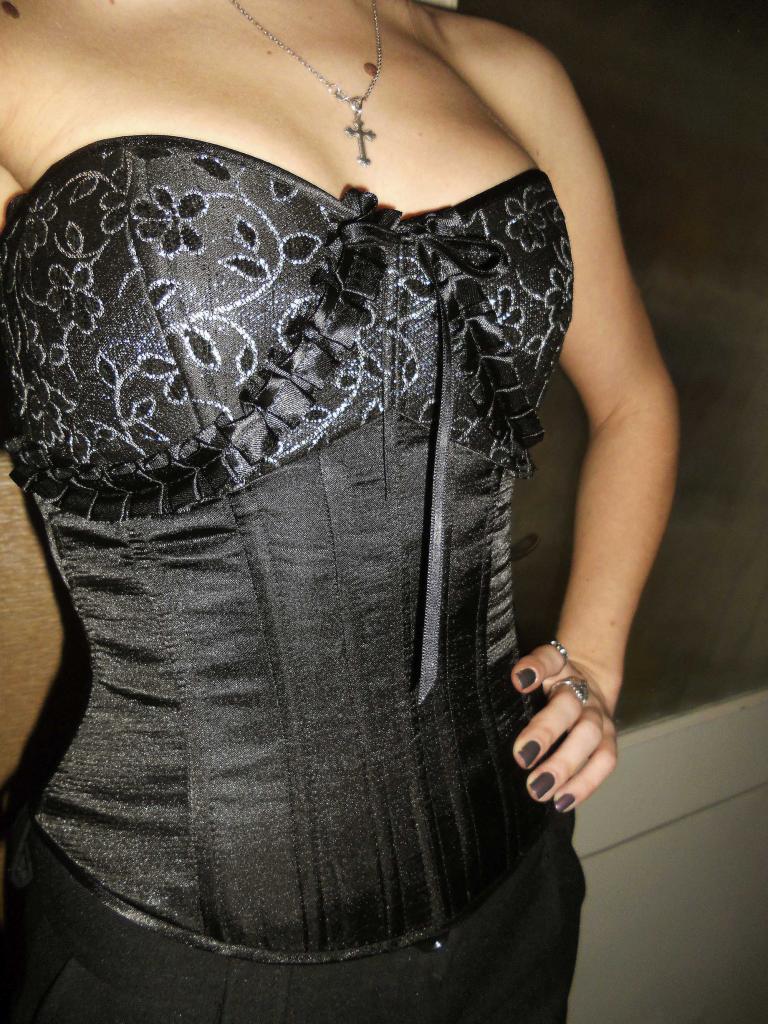 Вечерний корсет жесткий, из черного атласа, с декором спереди, сзади шнуровка. Очень хорошо утягивает талию и поддерживает грудь.