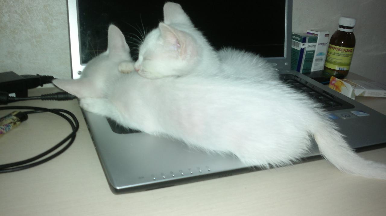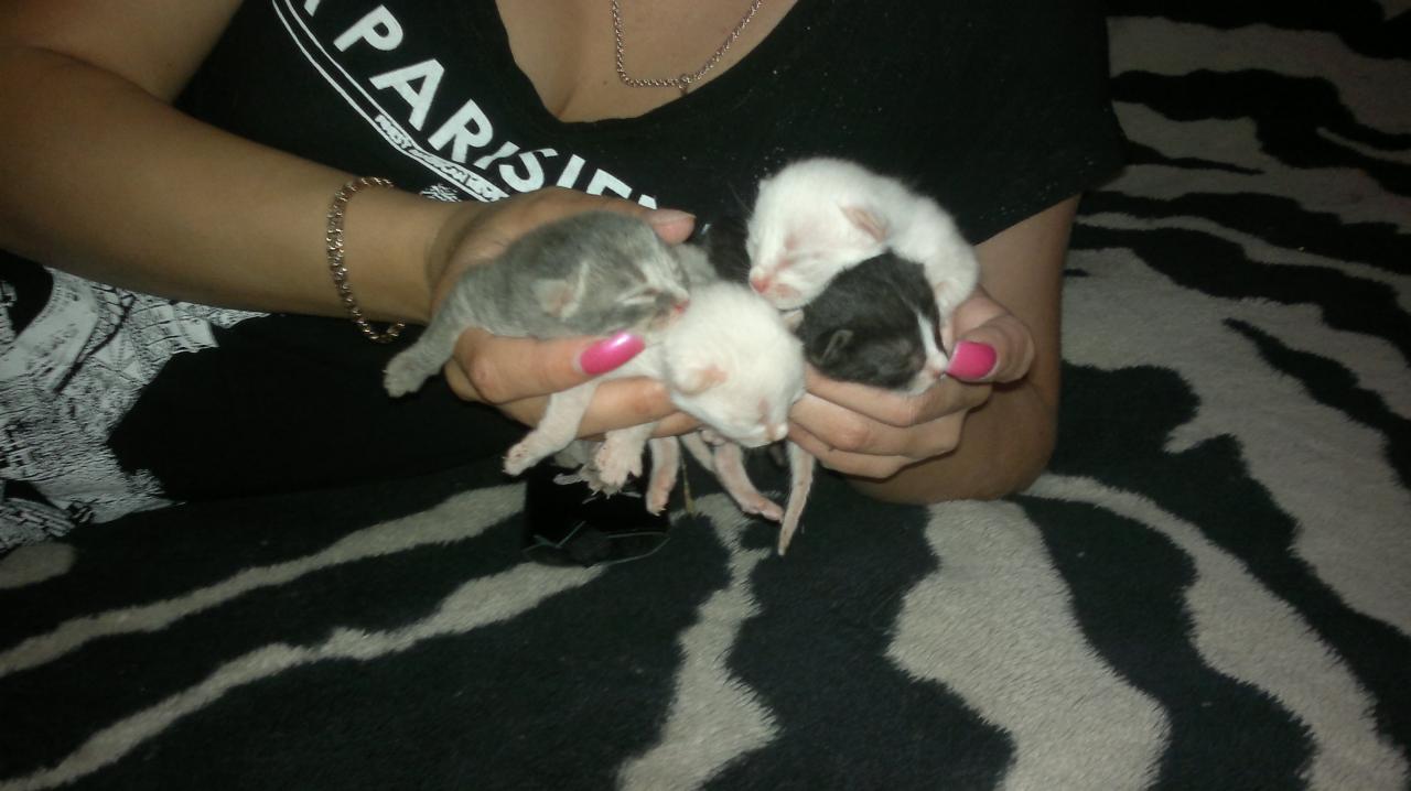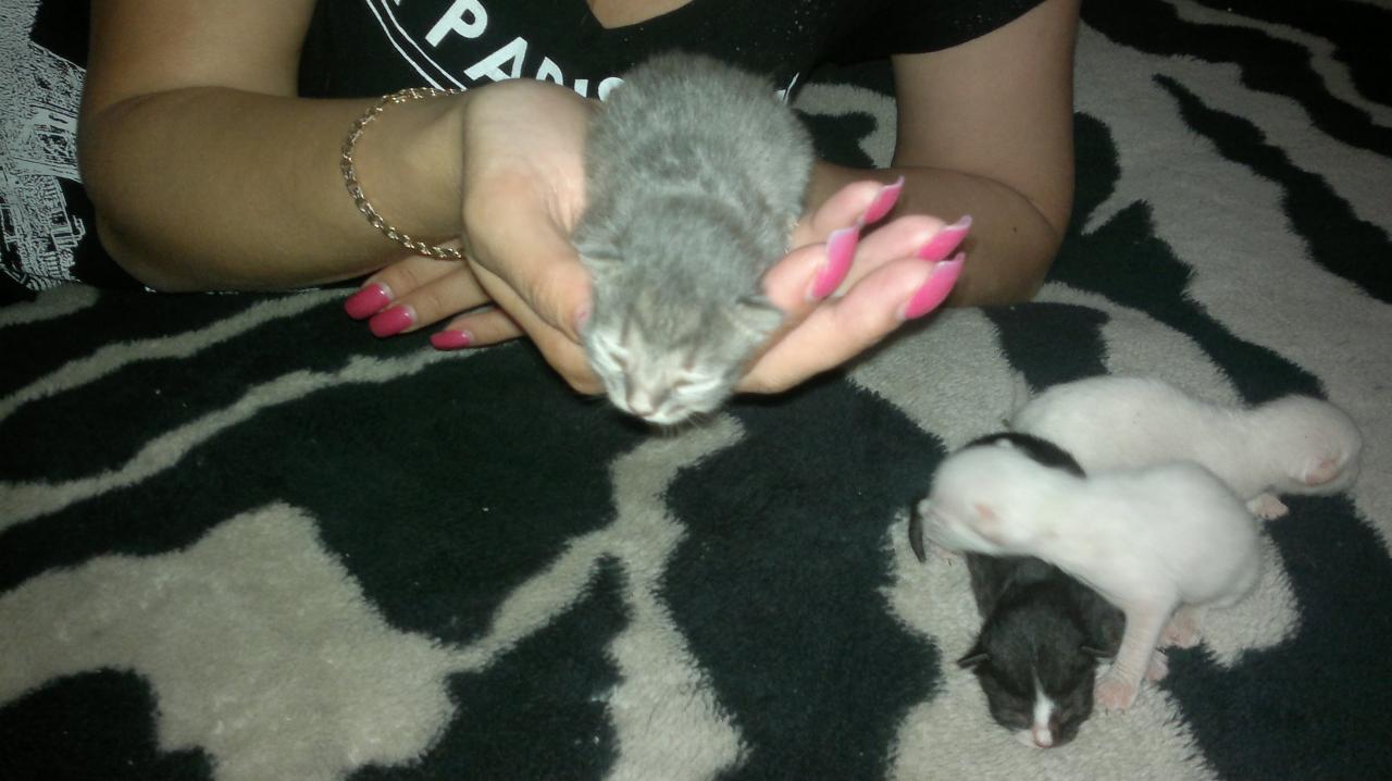 На новом месте работы позавчера вечером я познакомилась с местной беспризорницей - обычной серой кошечкой. Кошечка беременная, мне показалось, что хорошо беременная, но не катастрофически. Совершенно ручная, ласковая, там ее многие знают и подкармливают. Я звякнула Майе (Марлен) и мы решили кошку забрать, стерилизовать и выпустить назад. Отлов был назначен на вчерашний вечер, на 19,00. Весь день я не выпускала кошку из поля зрения, покормила, напоила, а к вечеру кошка стала вести себя как-то беспокойно, пыталась прорваться в соседний магазинчик и спрятаться там, но ее не впустили. Я решила забрать ее к себе в кабинет. Кошка успокоилась, поела, обошла-обнюхала всю комнату и попросилась пустить ее в тумбу рабочего стола. Стол еще полупустой и я ее туда пустила. Но Глаше (это я ее так назвала) в столе что-то не понравилось и опять беспокойные метания по кабинету и мяуканье. А нам только что привезли оргтехнику и еще не все коробки были выброшены (Слава Богу!). Кошке была предложена коробка из-под принтера, где ей очень понравилось и она прикемарила. А буквально через пол-часа снова возюканье в коробке и жалобные мявы. И вот тут-то я забеспокоилась. Кошка явно собралась рожать!!! Я уж ее просила не делать этого, объясняла, что забирать ее просто некуда и не на что. Кроме того, животик у нее был небольшой, и я даже подумать не могла, что пришел срок. Но... Когда ровно в 19,00 Майя подъехала, нас в кабинете было уже не 2-е, а 3-е. первенец родился в 18.45!!! Второго уже принимала Майя, третьего - Лена Котка, примчавшаяся на помощь, как только узнала о "сюрпризе". А потом кошка вылизалась, привела себя в порядок и мы решили, что это все, и забрав ее и детей в переноску, поехали домой. А когда приехали, оказалось, что котят уже 4-ро. Последний, родившийся в дороге так, что мы даже не услышали, немного меньше остальных. По окрасу - один цвета "Вискас", один - черно-белый и два чисто белых. Пол пока не известен. Возраст - 1 сутки.