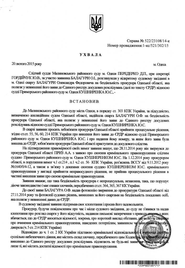 Суть рассмотрения моей жалобы в Малиновском суде, была рассмотрение бездействия прокурора Одесской области Приз А.А. о не внесении моего заявления в ЕРДР и не начале досудебного расследования в отношении следственного (третий год подряд) судьи Приморского суда Одессы - Кушниренко.