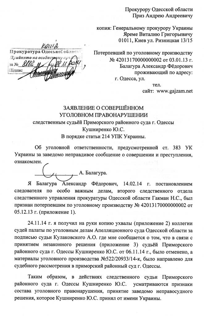 Как видно из ухвалы, мне было отказано в удовлетворении моей жалобы, на основании того, что я не предоставил суду доказательство самой подачи заявления о преступлении в отношении судьи Кушниренко в прокуратуру.