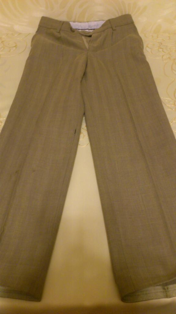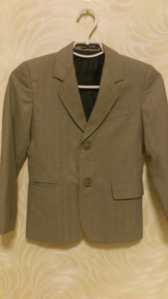 1. Костюм, состоящий из пиджака и брюк, песочного цвета. Указан наш размер на бирке - 32. Размер 128, возраст 7-9 лет. В отличном состоянии. Длина рукава пиджака от плеча - 47 см, длина брюк 77 см, объем 60 см. Для худенького мальчика. Состав ткани не указан, ткань на ощупь натуральная, костюм качественный.