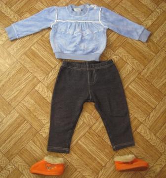 джеггинсы и кофточка 80 р-ра, на 1 год плюс-минус пару мес. Пинетки на овчине, стелька съемная 10.5 см. Кофточка застегивается на плече на кнопки, рисунок - зайчики. 60 грн за все