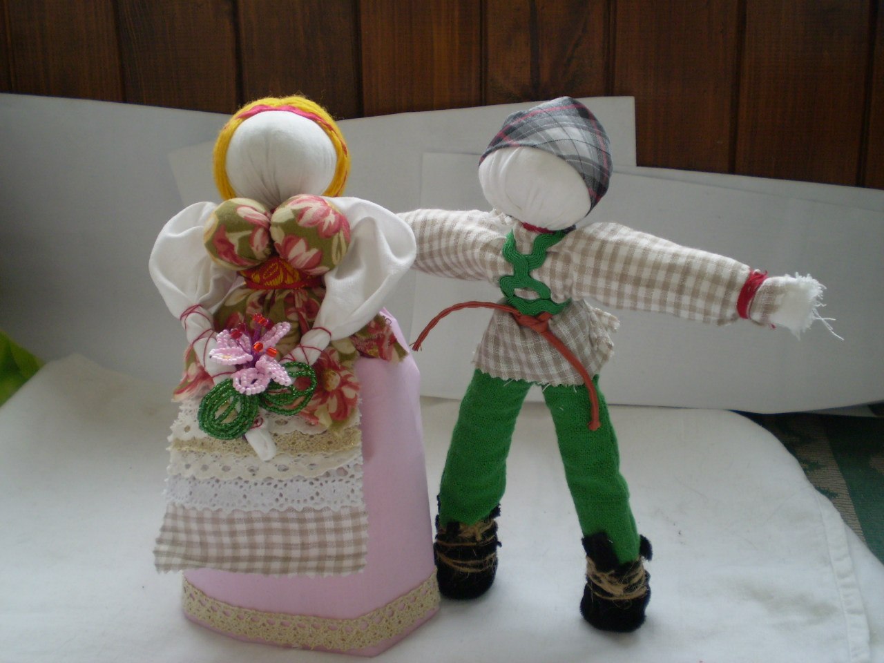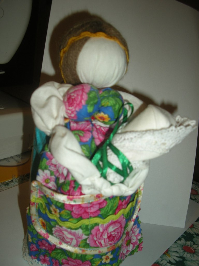В работе использую натуральные ткани, натуральные нитки, кружева, изделия из бисера, травы, наполнитель из обрезов ткани либо холофайбер...