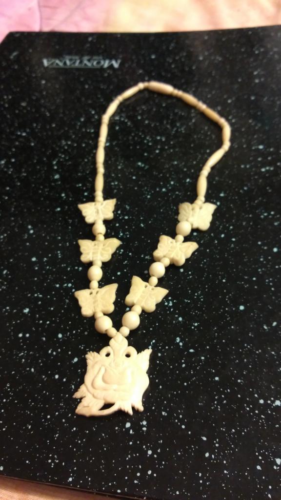 ID:	10225868На бусах кроме самих бусин -6 бабочек. На кулоне изображена роза. Материал -кость. Привезён из Вьетнама в 80 году. Б/у. 120грн