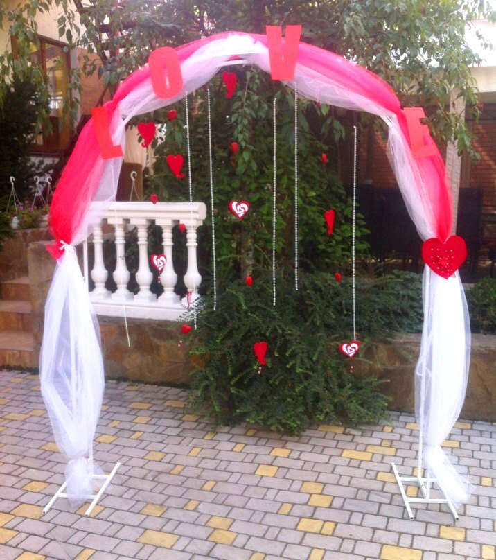Свадебная арка может использоваться как для декорирования выездной церемонии росписи, так и для декорации президиума молодых. Ее можно установить как в помещении, так и на улице.