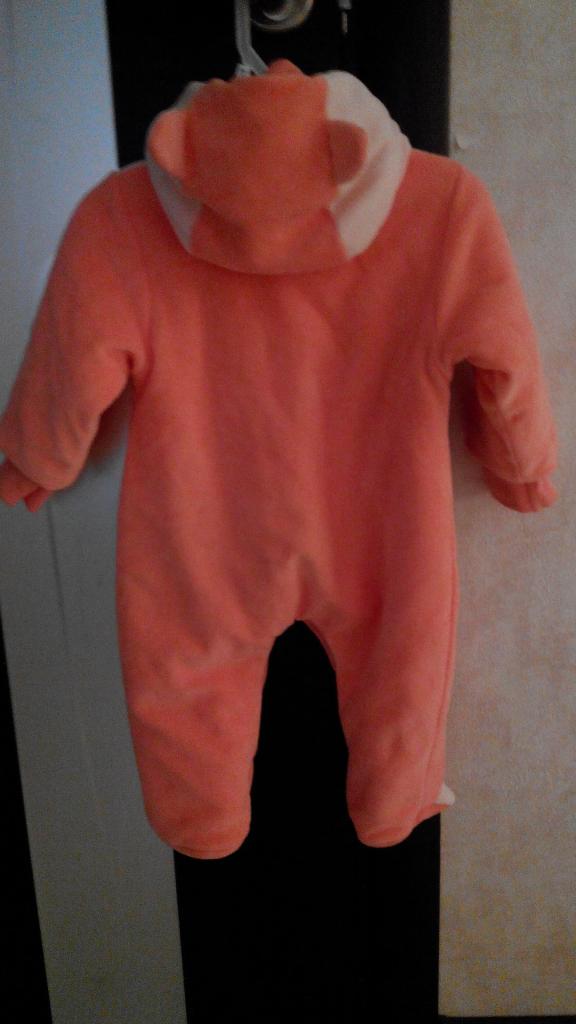 Шикарный, деми комбинезон для девочки. Цвет оранжевый. Верх - велюр, подкладка - х/б трикотаж, утеплитель - тонкий слой синтепона. Застежка на кнопки от горловины до стопы . Очень легкий, не сковывает движение малышки. Размер 62-68. Цена 270 грн.
