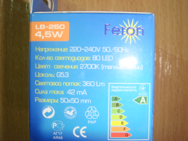Продам светодиодные лампы Feron---4.5w--2700k--360lm--теплый белый--в наличии ---31 шт--- цоколь 5,3---40 грн