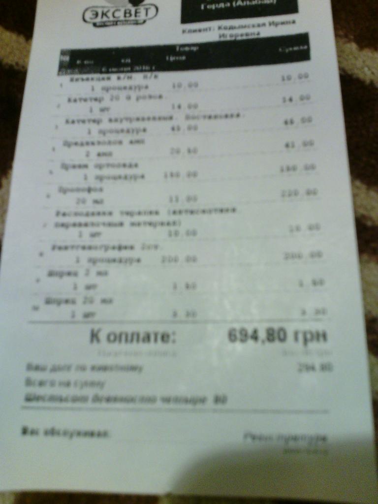 Самостоятельно такие расходы нам с мужем, к сожалению, не по карману. За сегодняшнее обследование нам выписали счет на 694,80 грн плюс 1130 за сутки за стационар включая препараты и пр. Мы оплатили на месте 400 грн, но нас настоятельно просили до конца дня проплатить оставшиеся 294,80 грн и аванс за стационар "хотя бы 1000 грн" (со слов доктора).