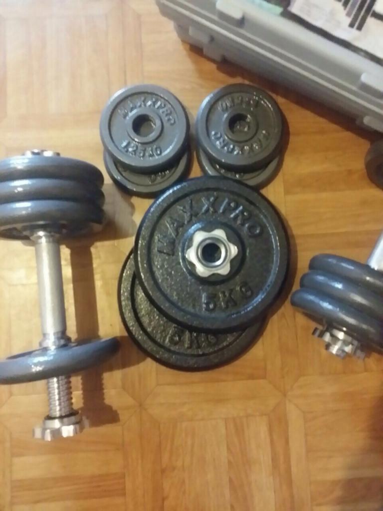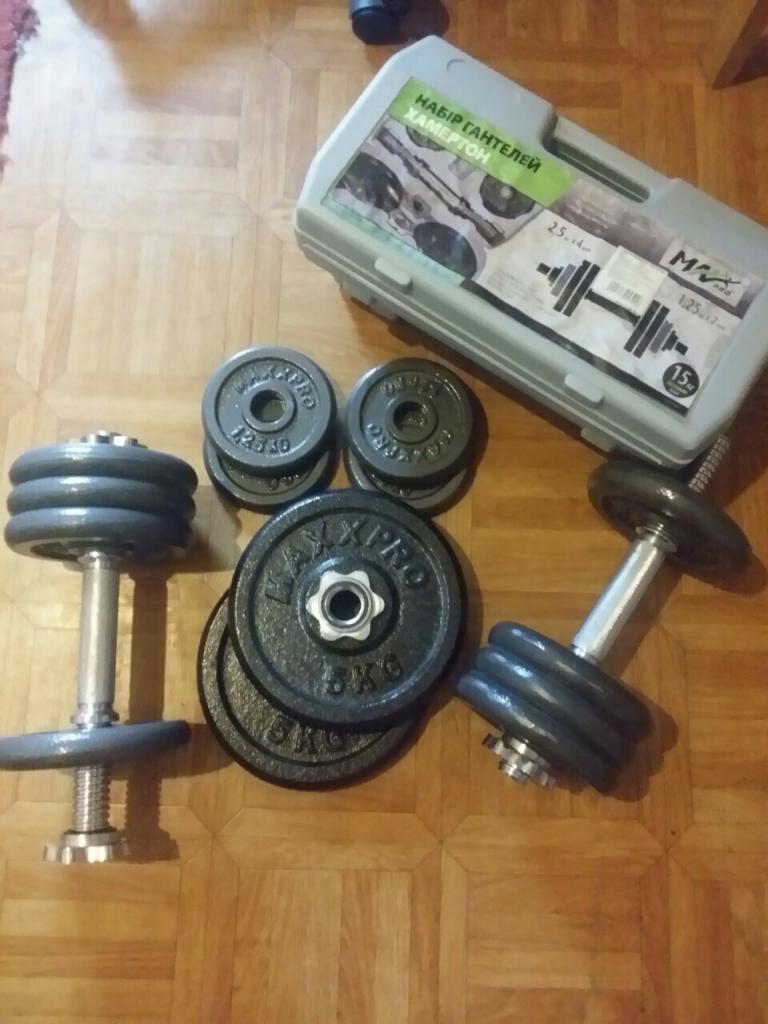 Две гантели наборные в чемоданах по 15 кг,+ 2 блина к ним по 5 кг.Гиря 24 кг.Скамья спортивная profi. Все покупали в интер атлетике http://shop.interatletika.com/. Состояние на пятерку. Находятся в центре города, Телефон для связи 0503368467. Гантели+ блины цена 1900. Скамья 1600. Гиря 300.