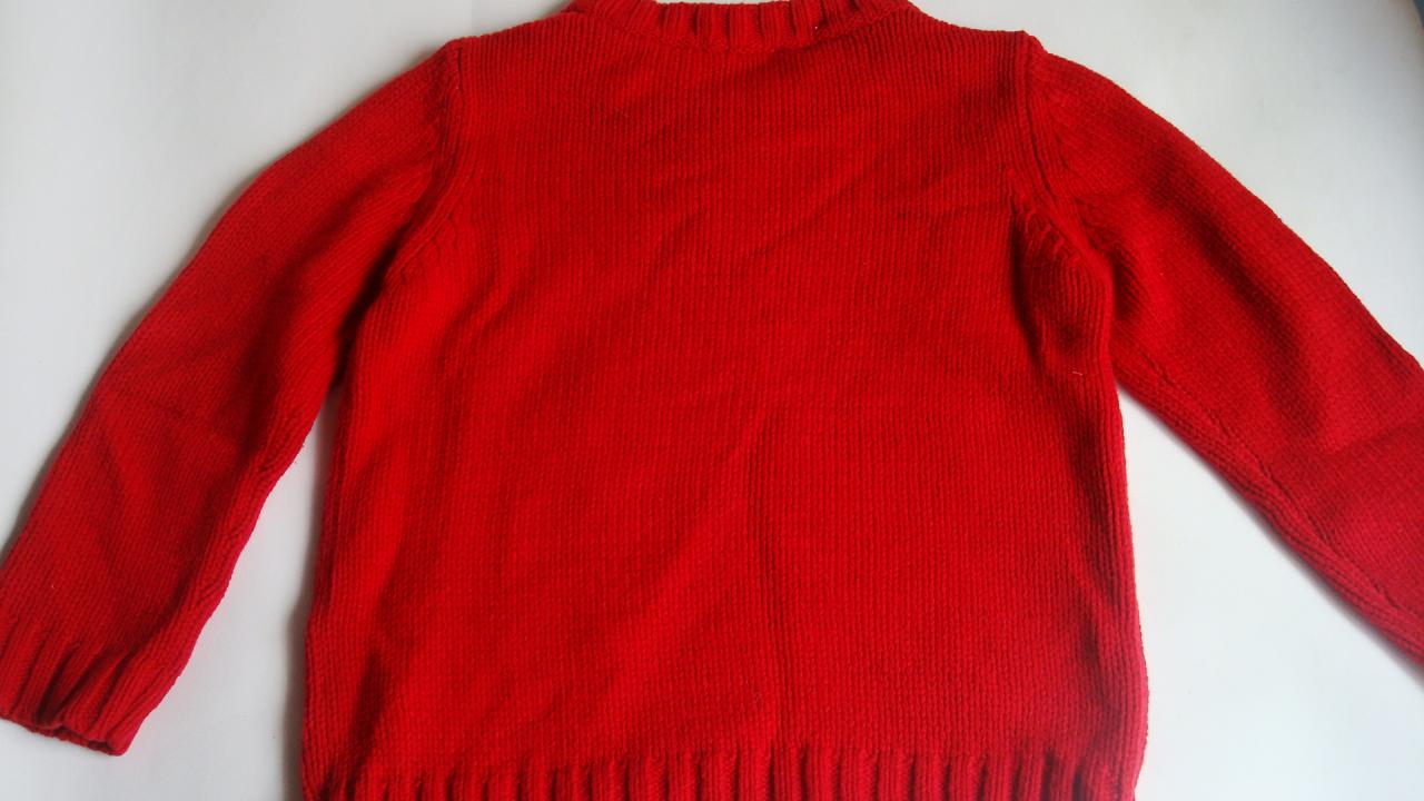Свитер надевался 1 раз, для примерки, подарили, но ребенку не понравился красный цвет, цвет шикарный- насыщенный красный, качество отменное, можно в школу-200 грн