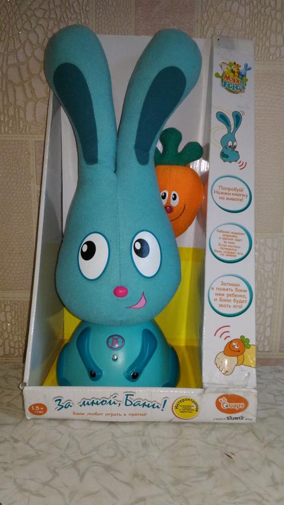 - функция звука - песни, хохот, некоторые фразы (русский язык), в том числе - кролик просит его обнять, когда приближается к ребенку