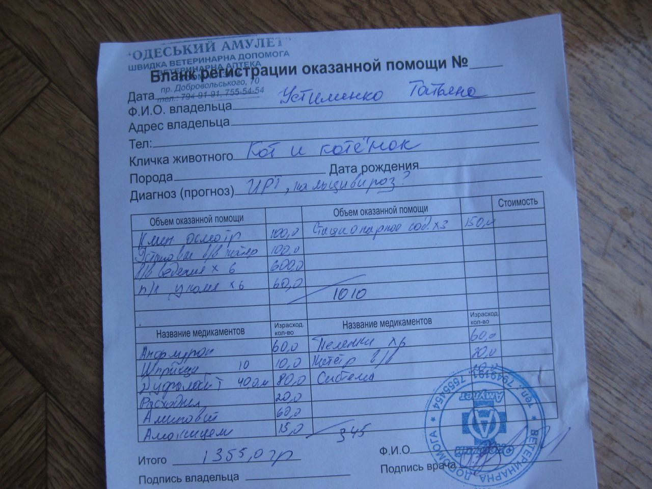 До этого мы лечили там же котенка, к сожалению, малыш умер. А долг еще весь не выплачен. Чек прилагается на обоих животных.