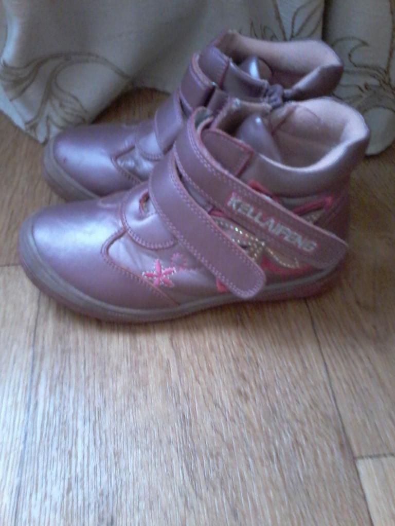 Ботинки в идеальном состоянии, кожа снаружи, внутри флис, очень красивые. Сбоку змейка, впереди липучки, так что подойдут на любой подъем. 200 грн.