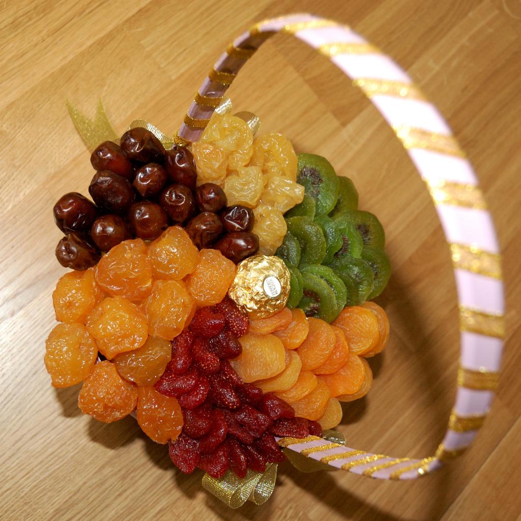 Осень - сезон сухофруктов. Букет из сухофруктов станет не только оригинальным подарком, но и очень полезным. Ароматные финики, инжиры, курагу, ананасы, персики, груши, папайю, памело, дыню можно замиксовать с орехами, лимонами, имбирем, кокосом, баночкой меда или варенья. Вариантов много на любой вкус и бюджет. Стоимость от 500 грн.