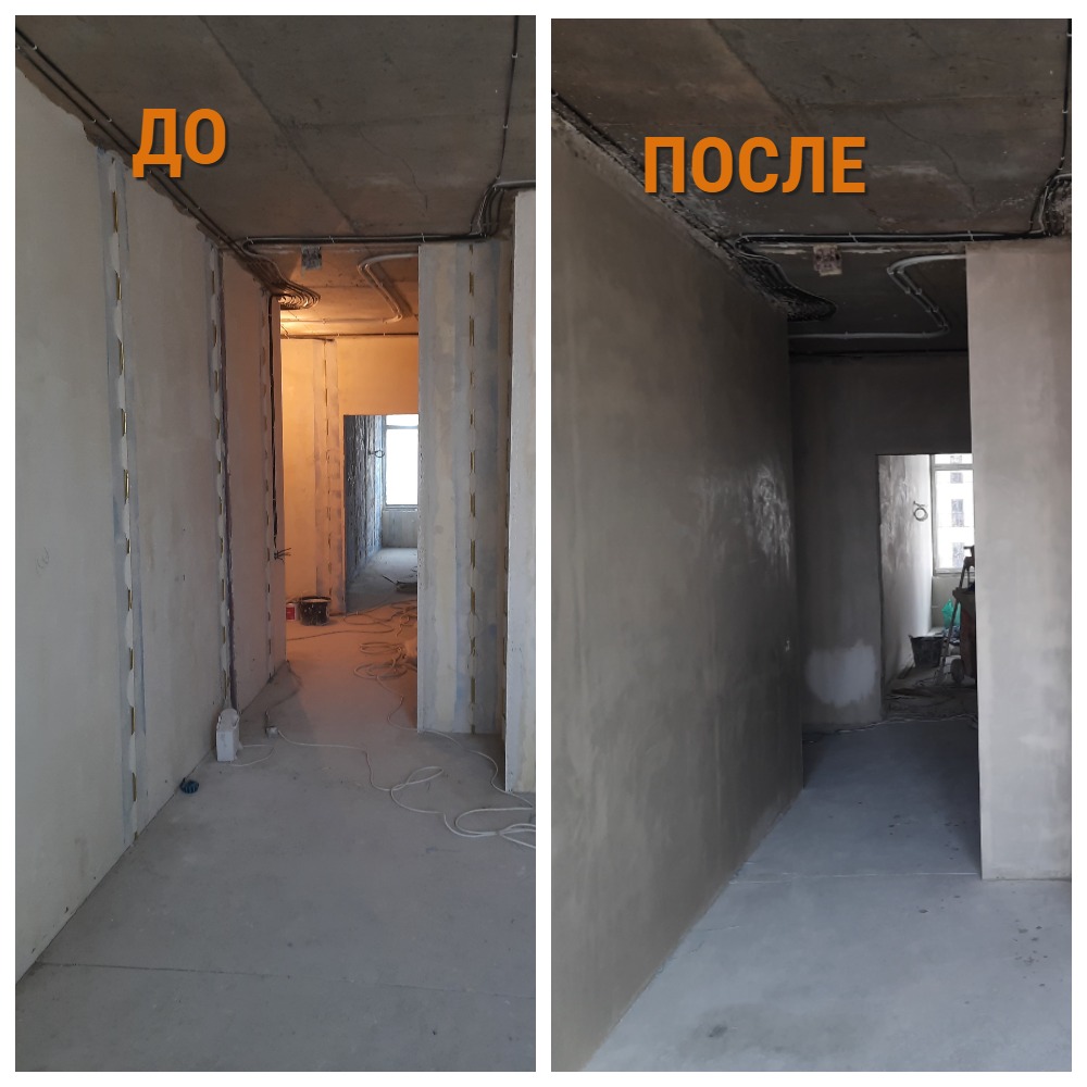 Этапы работЧистка основания, устранение неровностей, грунтовка стен. Замер уровня лазерным нивелиром и выставление штукатурных маяков , укрепление углов.