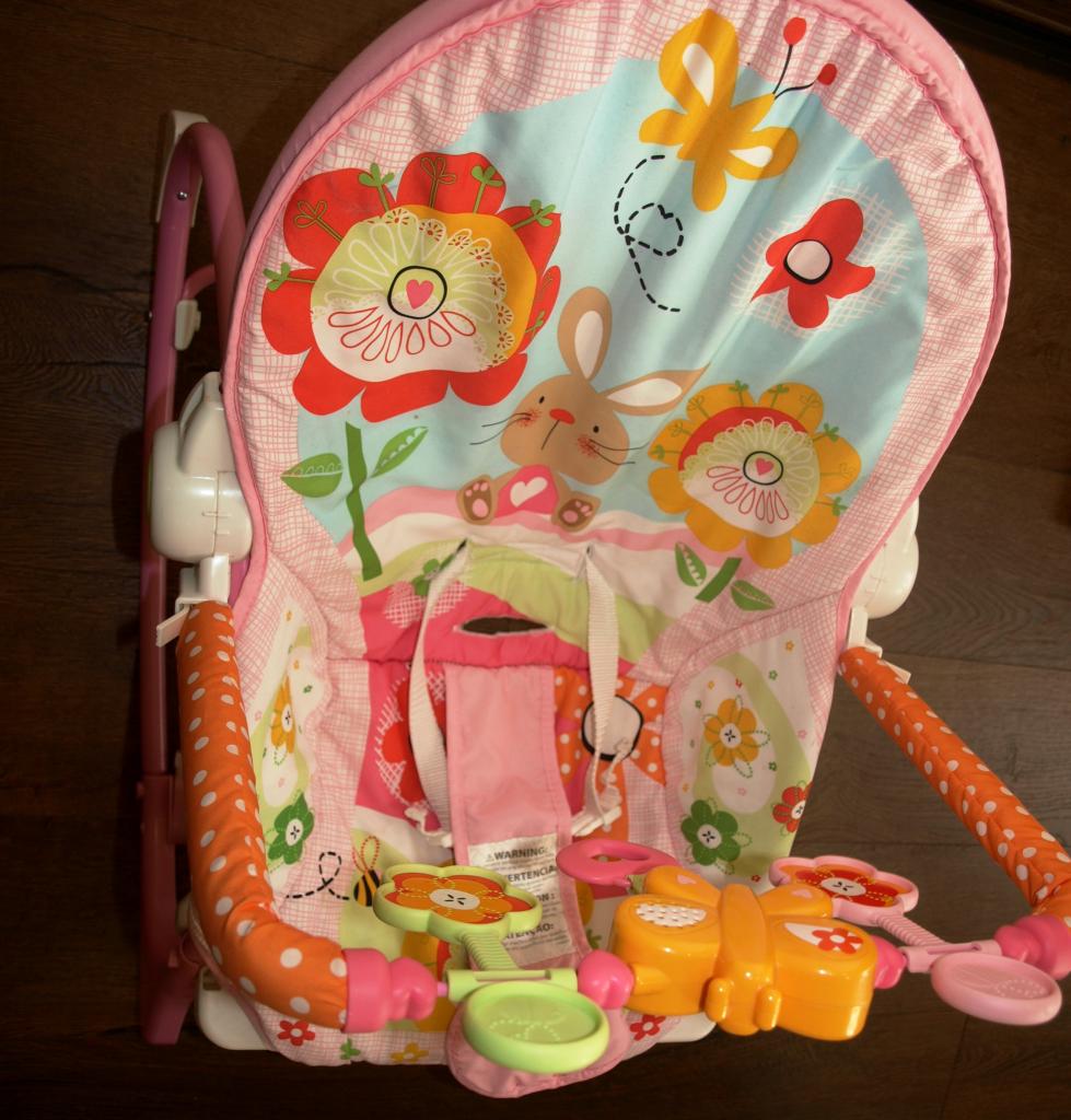 Дуга с погремушками легко снимается, поэтому ребенка так удобно вынимать и вкладывать в кресло.
