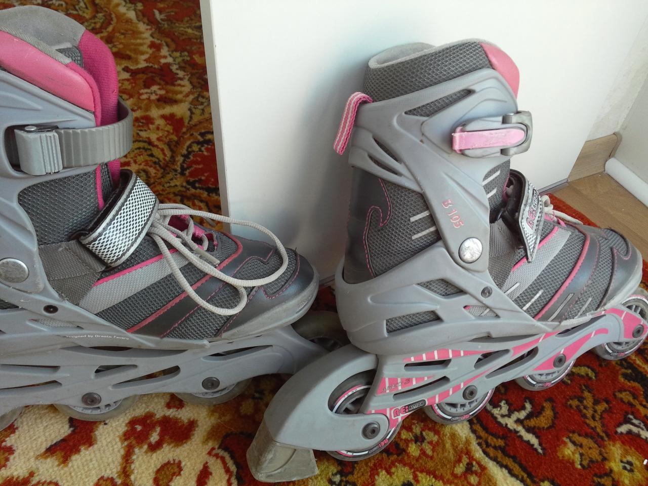 Продам коньки роликовые 37 р. на ножку 24, 5 см в хорошем состоянии. Купили дочке в Спортмастере в 12 лет, каталась в течении года, пока стали маленькими. Жесткость колес 80 А.