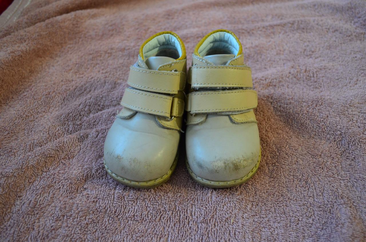 Кожаные, ортопедические ботинки подойдут и девочке и мальчику. Цвет - бежевый, с красивым рисунком, который не потерял свой вид. Немного сбиты носки, так как это практически первая обувь. По стельке 13,5см. Цена 150грн.