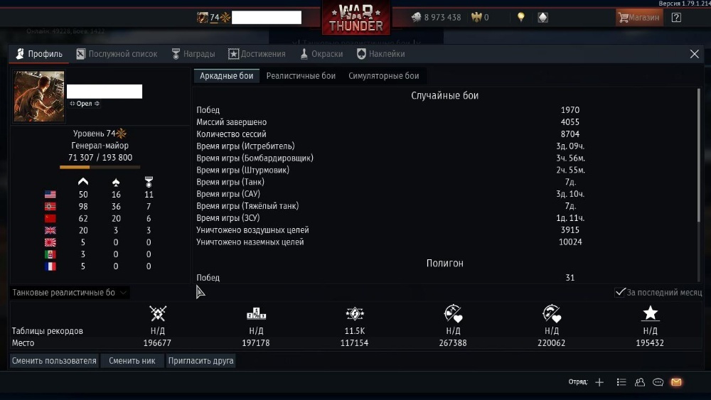 Продам свой аккаунт в "War Thunder". Продаю из-за нехватки времени, да и моё нынешнее железо уже еле тянет. Садись в танк / самолёт и воюй. Также отдам почту к которой привязан аккаунт. Современной техники очень мало т.к. в основном интересовала техника 40-х годов. Максимальные боевые рейтинги по нациям (не нужно страдать на резервной технике):