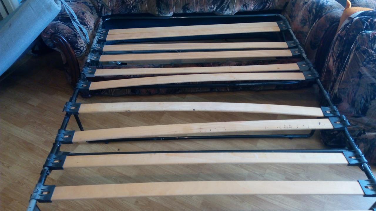 Механизм в диване работает, но заедает (надо шото там покрутить и настроить), нужно прикрутить ламели (они есть), заменить или постирать матрац.