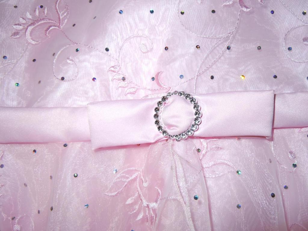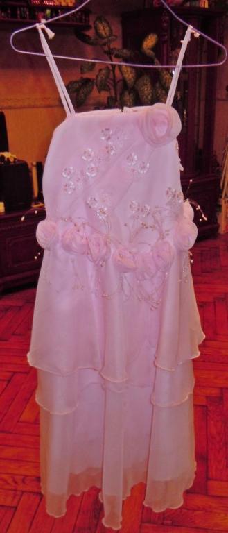 4)Розовое платье с легкой шифоновой юбкой,розами и белыми бусинами,на тонких бретелях,длина бретелей регулируется.