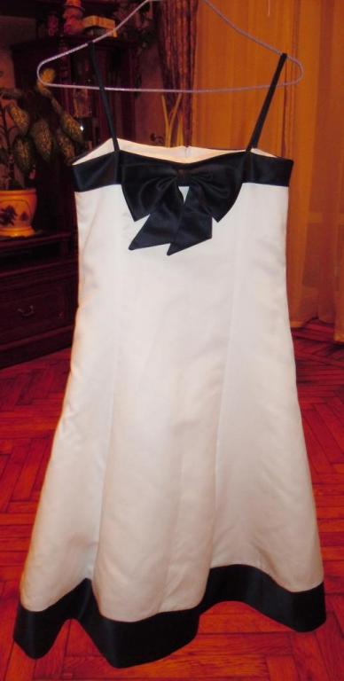 3)Платье из плотной ткани,белое с синим бантом на груди,на тоненьких бретельках (регулируемых)