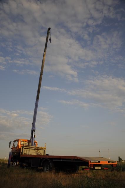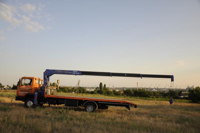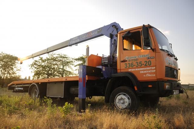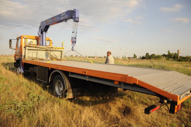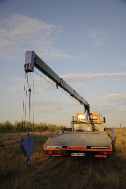 на машине с краном-манипулятором (грузоподъемность крана до 5 тонн, вылет стрелы - 12 метров).
