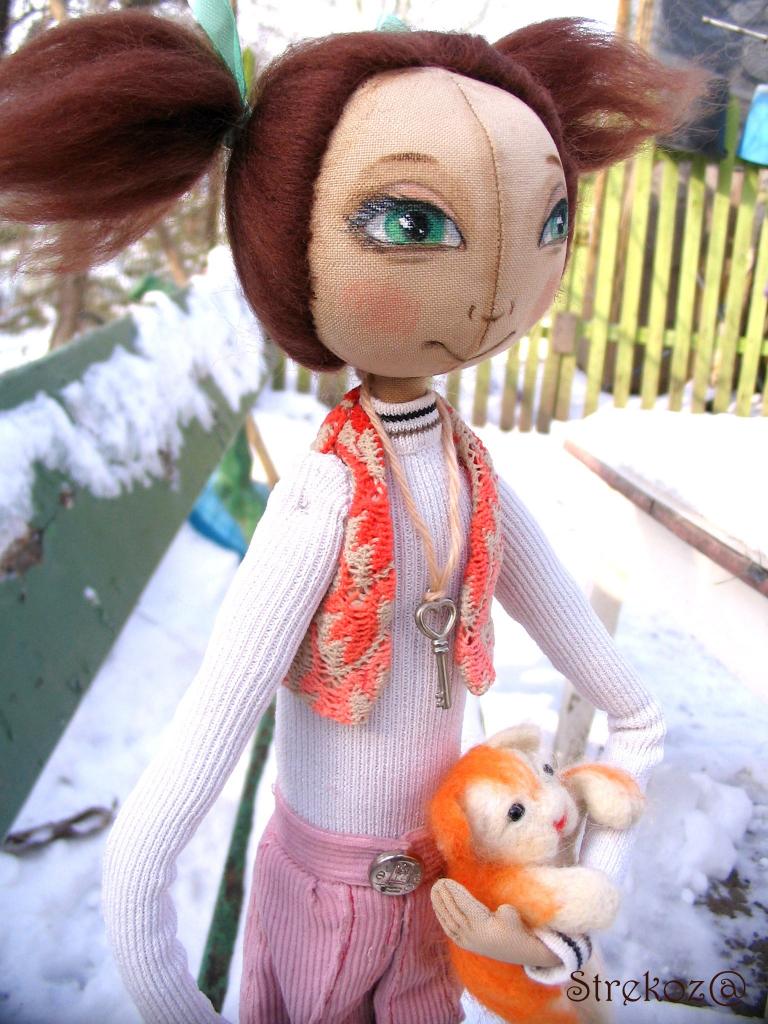 рост - 47 см., габардин, батист, кожзам, фурнитура, волосы - шерсть для валяния, наполнитель синтепух, роспись - акрил.
