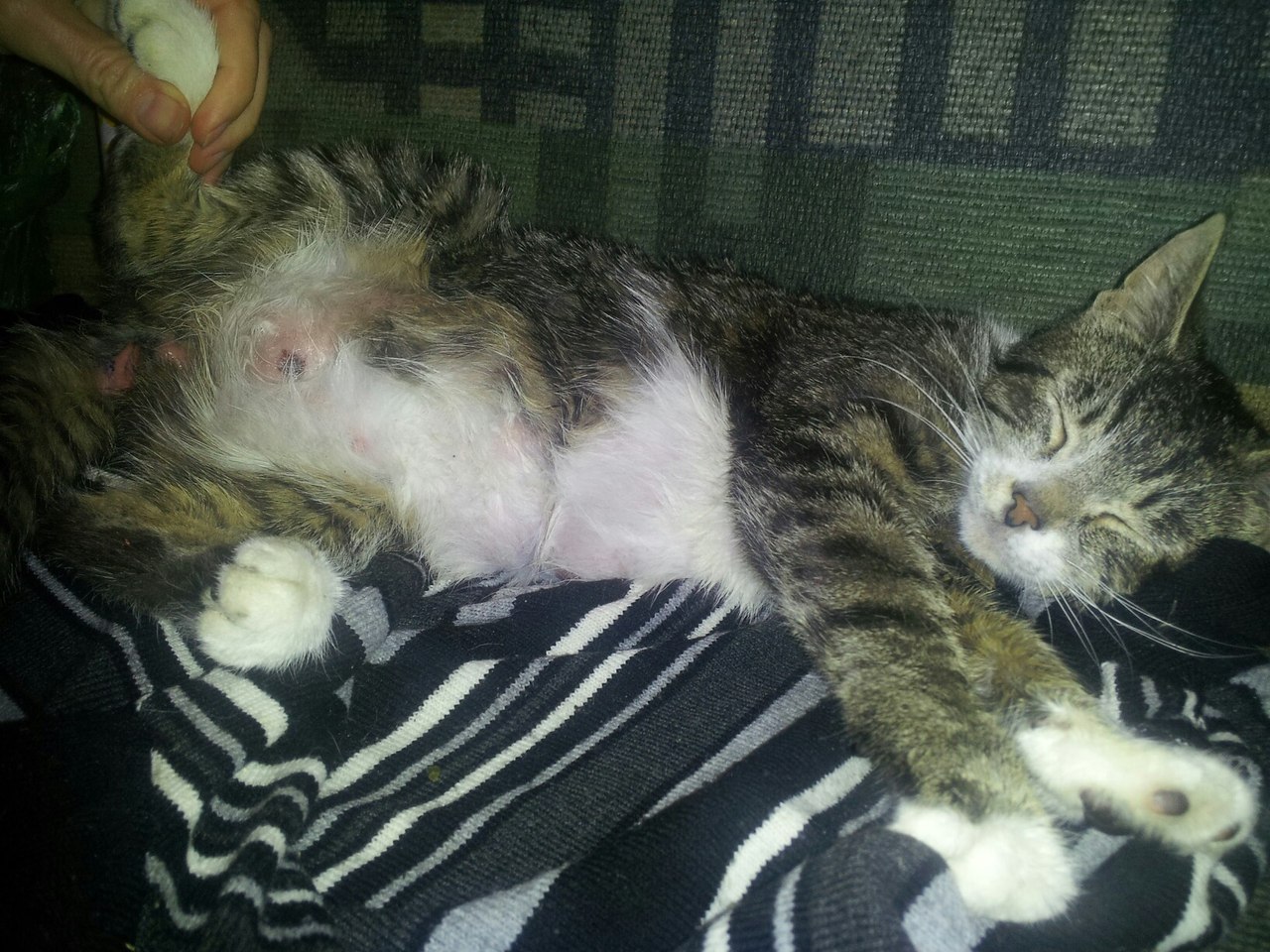 Но буквально с месяц назад, съезжают ещё одни.... И в коридоре мечется абсолютно перепуганное , шугающаяся каждого звука существо. Тогда мне показалось, что это котенок месяцев 3-х. Начала по тихоньку подкармливать. Через неделю она начала подходить уже к руке. Через 2 дала себя гладить, на третьей неделе я взяла её на руки. И тогда я нащупала какие-то уплотнения на груди... Особого внимания не предала, но вот проходит неделя, девочка становится похожа на шарик....Полностью опухли все молочные железы...Понимая, что тянуть дальше некуда, несу её в клинику. Ей поставили диагноз "ювенильная гиперплазия молочных желёз" и лечение. А вот лечение, к сожалению я не потяну... Народ, прошу у вас помощи!