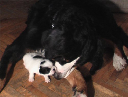 Бернский зенненхунд...собака которая может быть нянькой не только для детей но и для щенков другой породы...у меня в доме живет бернц...японский хин...и русский гладкошерст.той-терьервот...