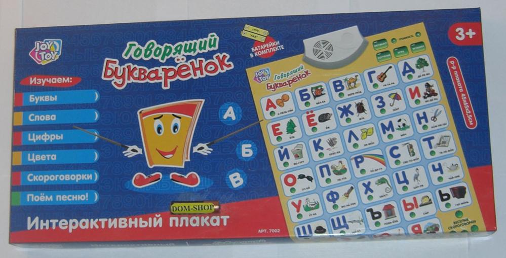 Продам новый интерактивный плакат "Говорящий букваренок" JOY TOY. Интерактивный плакат "Говорящий букваренок" это забавный букварь сам будет обучать ребенка. Вам надо только прикрепить его к стене и включить.Функции говорящего плаката: "Изучение" - Букваренок начинает произносить все буквы алфавита по порядку; "Экзамен" - Букваренок предлагает найти букву, после двух неверных ответов происходит переход к следующей букве; "Игра" - Букваренок предлагает найти изображения; "Давай споем" - Букваренок предлагает спеть веселую песенку;Тренировка произношения букв-слов, цифр-цветов;"Веселые скороговорки" - Букваренок помогает выучить скороговорки. Возможность самостоятельного изучения. Размещение на столе или на стене. Регулируемая громкость воспроизведения. Влагостойкая поверхность. Сенсорные кнопки. Автоматическое выключение плаката. Электронный говорящий плакат Работает на 3 батарейках типа "ААА". Размер озвученного электронного плаката: 45 х 65 х 2,5 см.