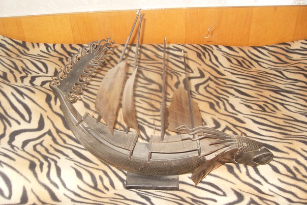 Знаю,что по фото сложно определить....на первых двух фотках проблемы с мачтами и один парус оторван,пото большая трещина сверху на корпусе,и на последних фото отломан рог на голове.Материал из чего сделан корабль,тоже трудно определить!?Искал в нете что-нибудь подобное,но не нашёл...