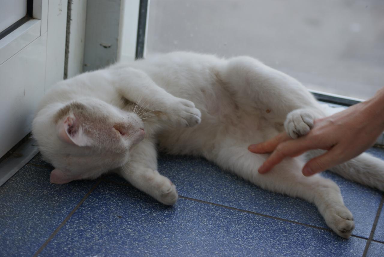 Белый он только формально. Улица оставила свой след слоем пыли, благодаря чему он стал серым. Но Белый не забыл что он домашний кот. Все так же ластится к людям, кот.его кормят, без проблем идет на руки и спокойно залезает в переноску - как будто всю жизнь в ней сидел. Ну, в общем, все признаки бывшедомашнего жителя - на лицо, дворовые так себя не ведут.