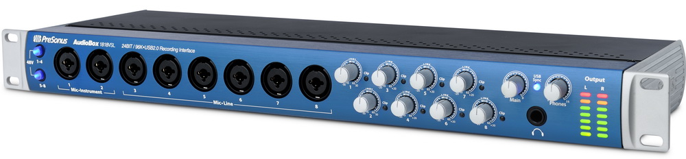 AudioBox 1818VSL - рэковый аудио-интерфейс с 8 входами (6 комбо mic/line, 2 комбо mic/instrument), на каждом - преампы XMAX. 8-канальный ADAT I/O (4 канала на 88.1/96 kHz); стерео S/PDIF I/O; MIDI I/O; word-clock выход. Прграммное обеспечение VSL - микшер 26 x 18 (22x14 на 88.1/96 kHz), динамический процессинг Fat Channel от StudioLive 16.0.2, EQ и фильтр высоких частот на каждый аналоговый вход и DAW-возврат, 2 шины стерео-эффектов с ревербератором и делеем.