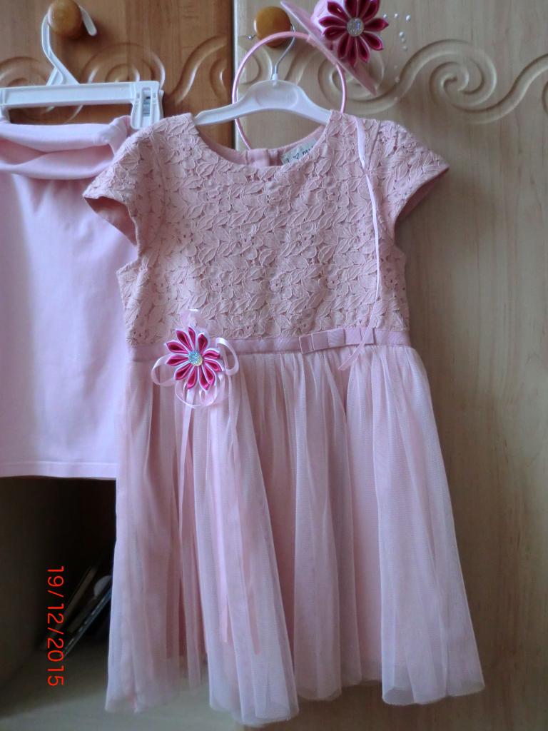 К платью идет маленькая шляпка на обруче и розовый гольфик.