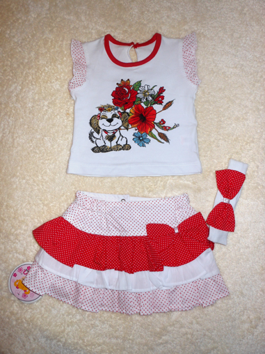 костюм тройка на девочку (майка, юбка, повязочка). новый с биркой, пр-во Турция. размер пишут 74 (идет на 66-74). купила в прошлом году на kidstaff.com.ua за 200 грн. поносить не успели, в этом году уже мало (у нас рост 74, вес 10, немного тесновато, летом не оденем((). костюмчик классный, юбочка сзади на кнопочках, по бокам резиночка, на майке яркий рисунок со стразиками.