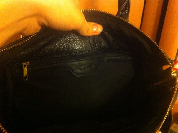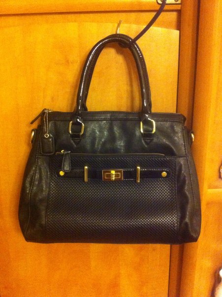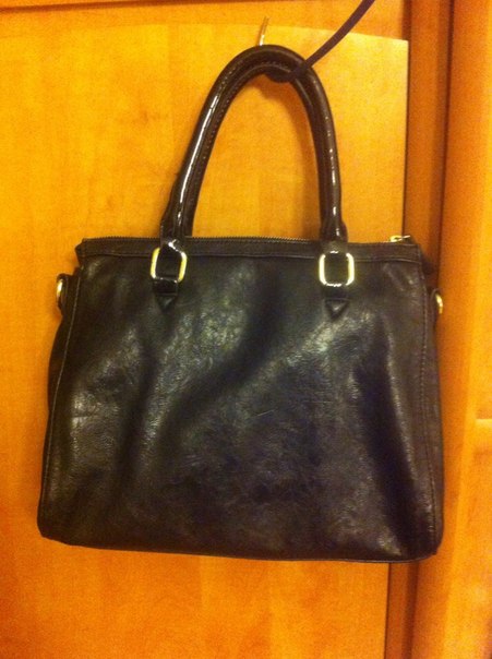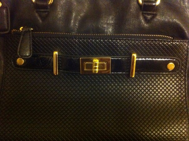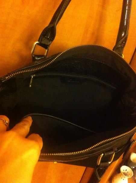 Сумка кожаная, очень мягкая. Среднего размера. Ручки и вставка на сумке лаковые. Внешний карман - мелкая "плетенка". Фурнитура - золото.