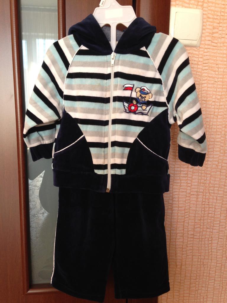 3) Костюм темно синий в полоску, велюр, весна/осень, на 12 мес, длина куртки 32 см, рукав 24 см, штанишки 39 см, 50 грн.