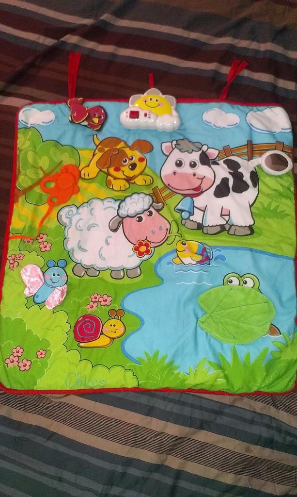 Коврик создан таким образом, чтобы игра малыша не была бесполезной. Так, например, в зеркальце, прикрепленное на хвост коровки, малыш сможет увидеть свое отражение. А прорезиненное кольцо будет служить в качестве прорезывателя для зубок. Если малыш нажмет на улитку, она будет пищать, а маленькая птичка умеет летать, только ей нужно немного помочь.